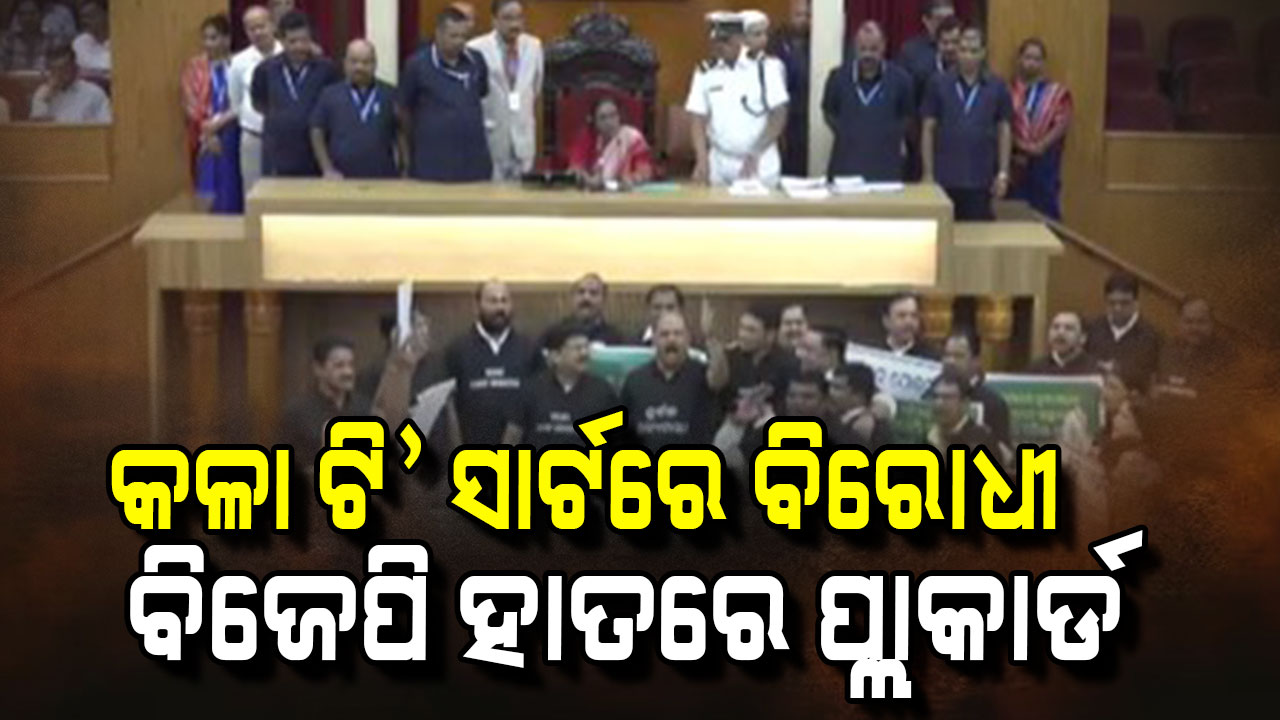 କଳା ଟି’ ସାର୍ଟ ପିନ୍ଧି ବିରୋଧୀଙ୍କ ପ୍ରତିବାଦ, ବିଜୁ-ନବୀନ ଟ୍ରଷ୍ଟ ନେଇ ପ୍ଲାକାର୍ଡ ଦେଖାଇଲେ ଶାସକ ଦଳ